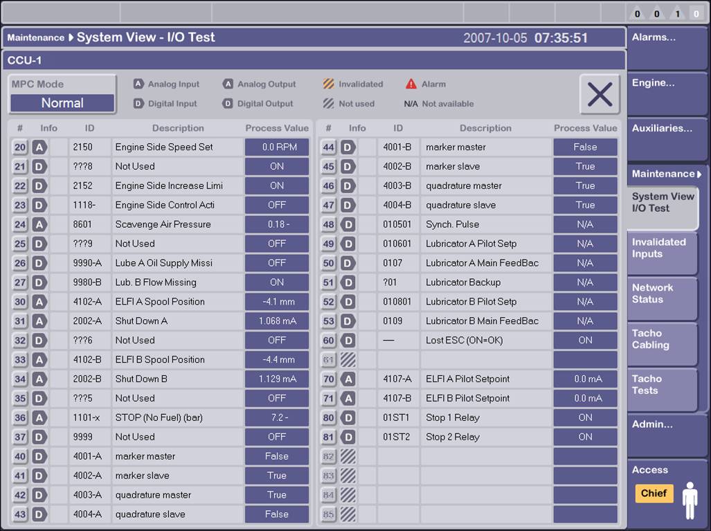 change between normal and test mode return to previous page change access level set time tacho test tacho cabling network status invalidated channel inputs hydr sys, me cyl lube engine ops alarms list